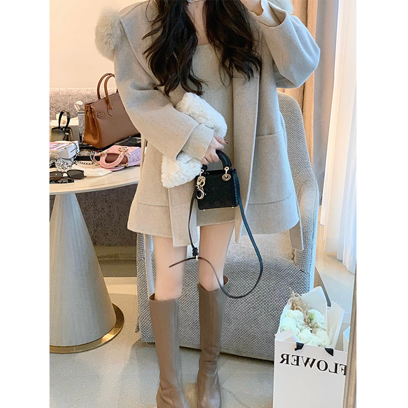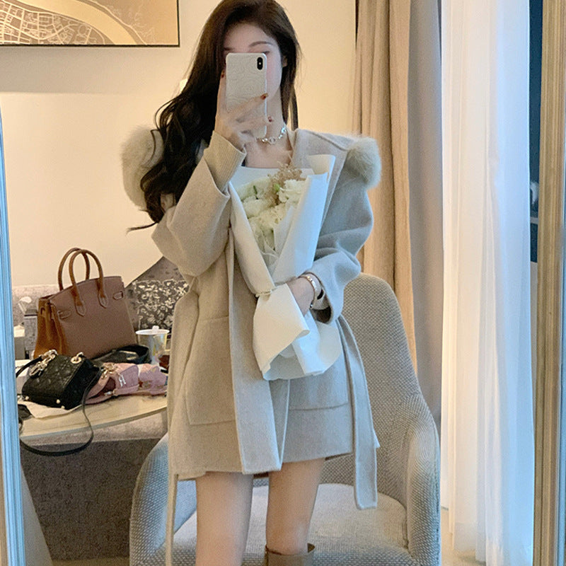 2025 stor pälskrage äkta rävhår snörning huva dubbelsidig ullrock medium och lång höst och vinter ullrock kvinnor