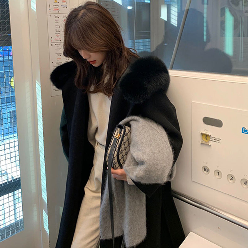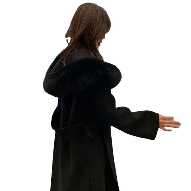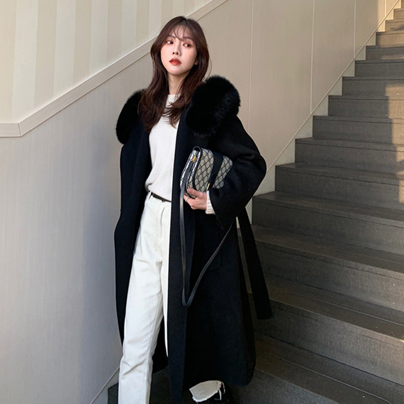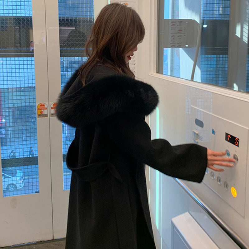 Enfärgad temperament lång stor ficka dubbelsidig ullrock räv pälskrage höst och vinter snörning gränsöverskridande ullrock kvinnor