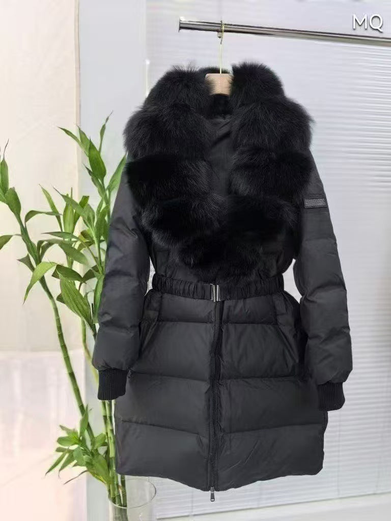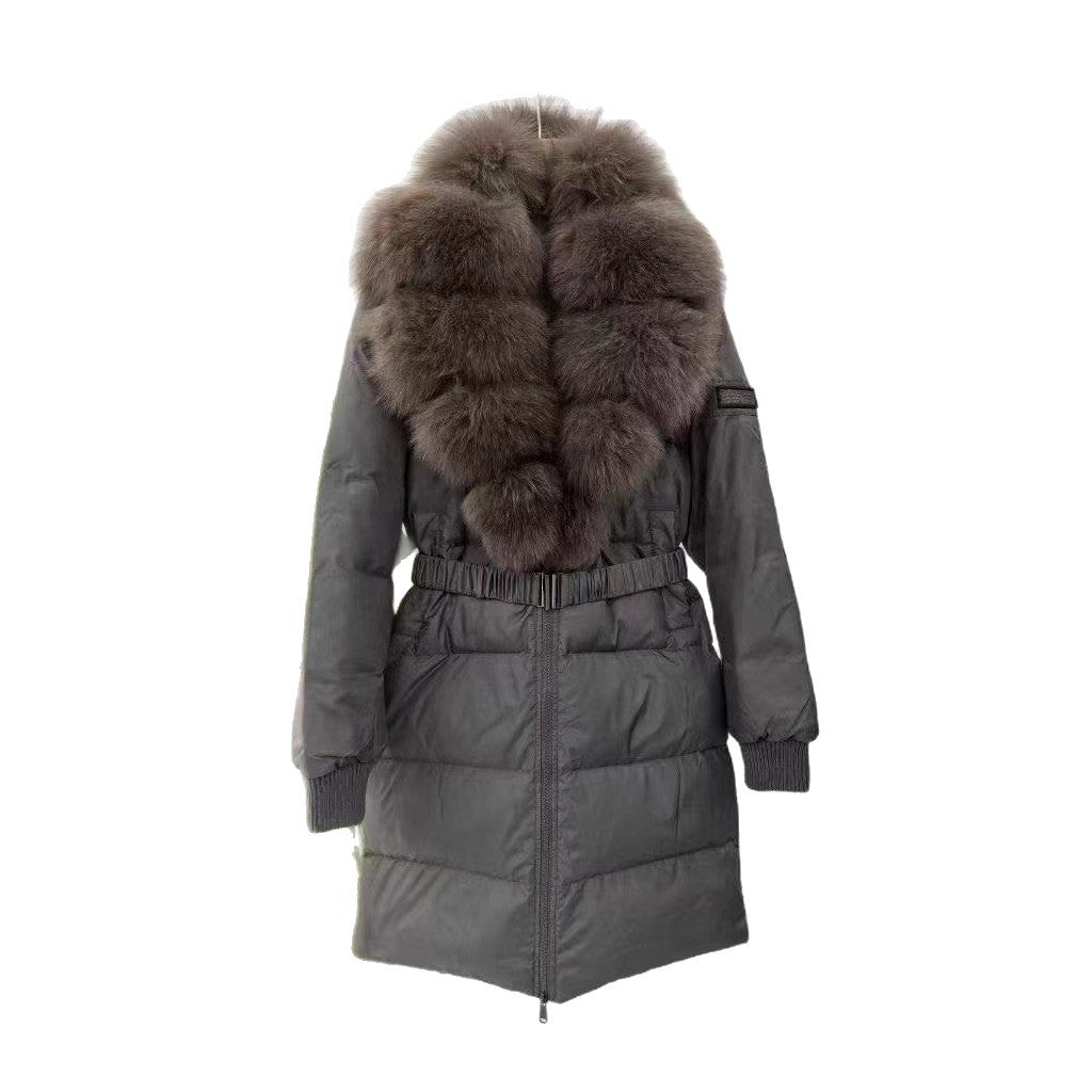 Fel rävhår stor pälskrage 2025 vinter ny dunjacka kvinnors långa snörning i midjan ädel pälsjacka