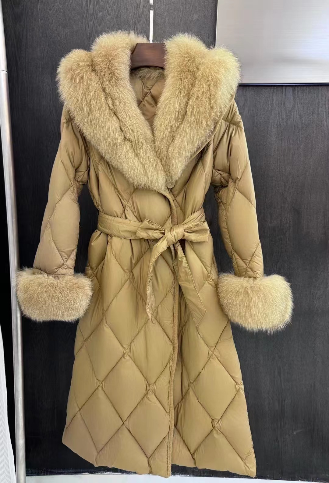 Haining päls kvinnors 25 vinter nya medelstora och långa unga räv pälskrage gås dunjacka kappa kvinnor