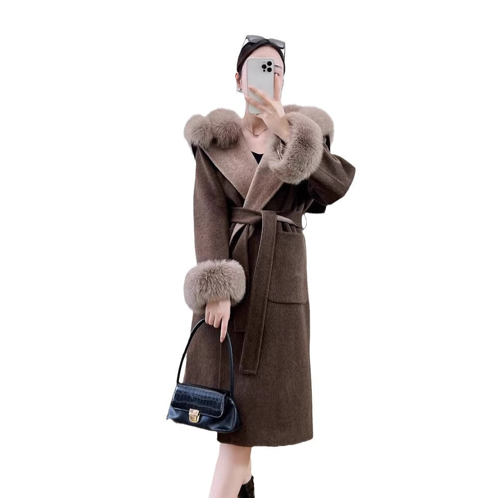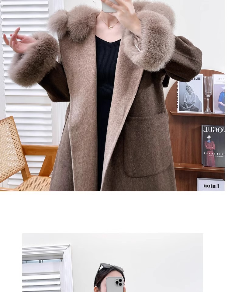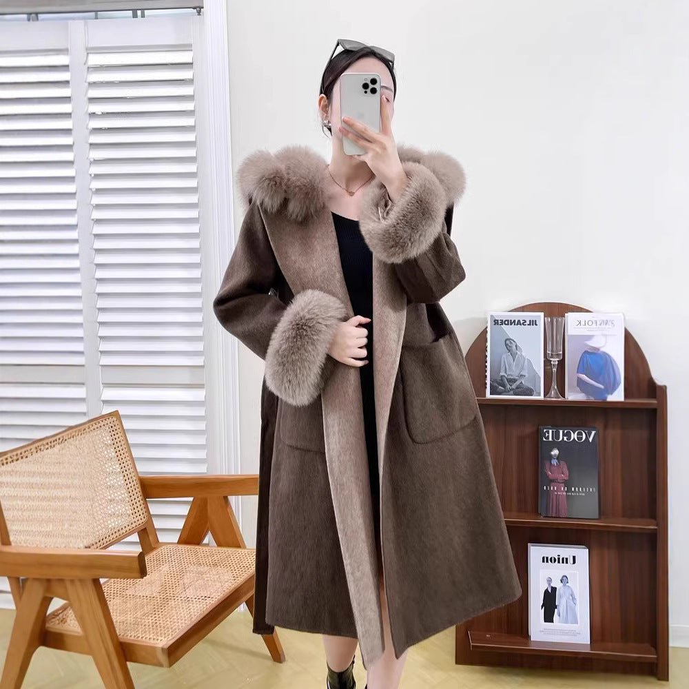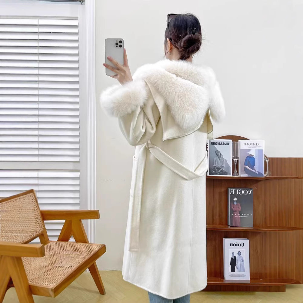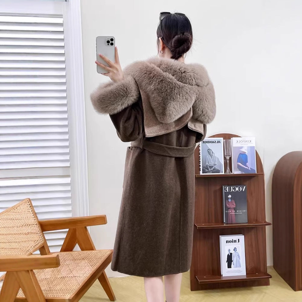 Höst och vinter ny dubbelsidig kashmirrock kvinnors importerade rävpälskrage ängelvingar medium och lång ullullrock