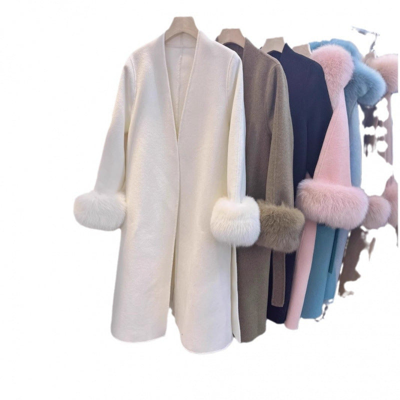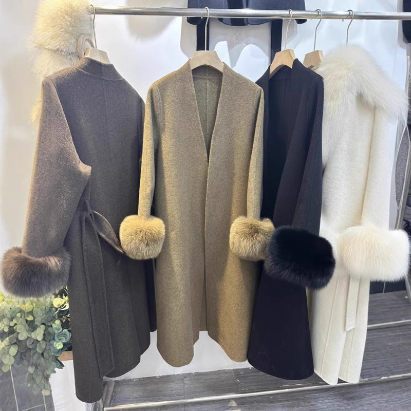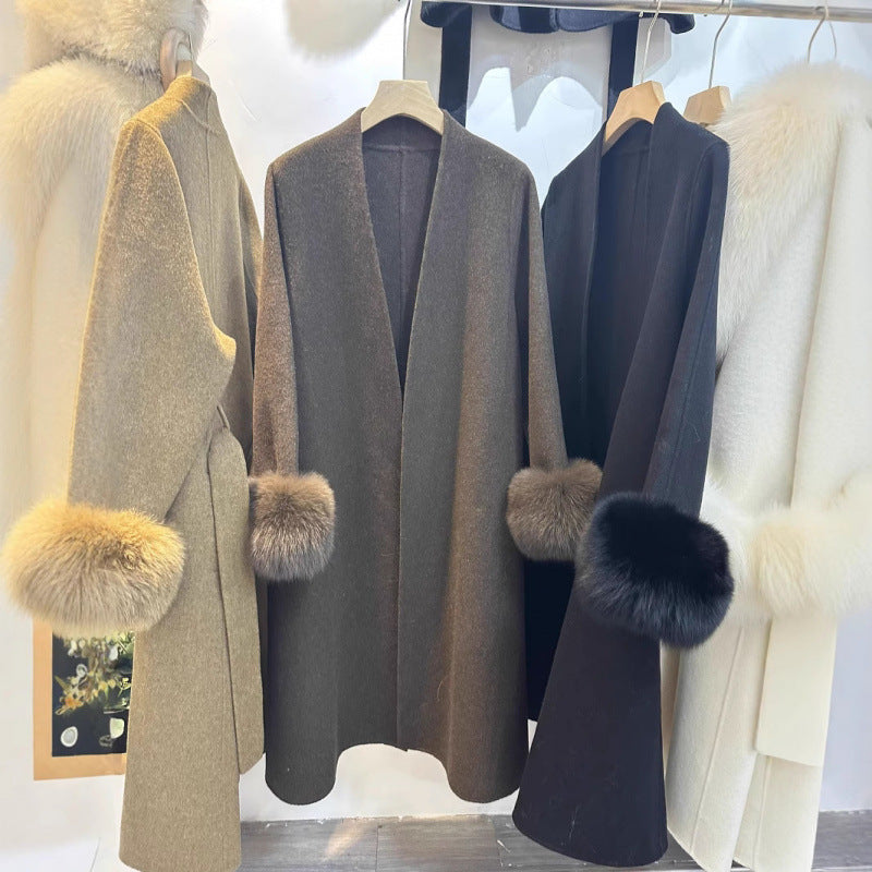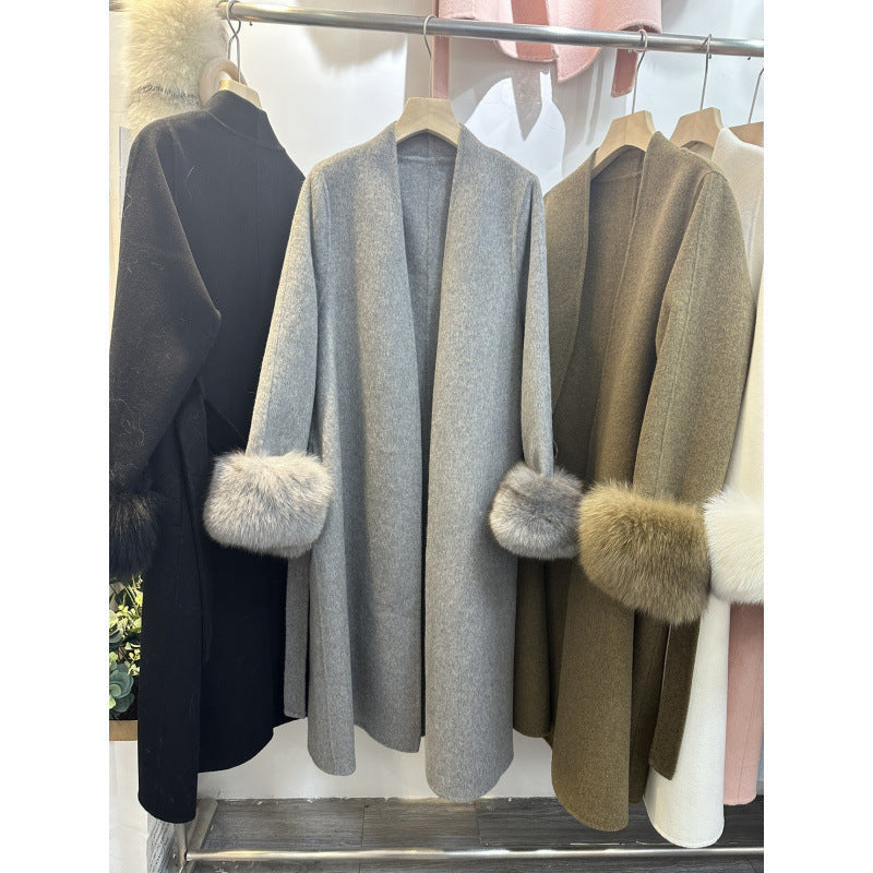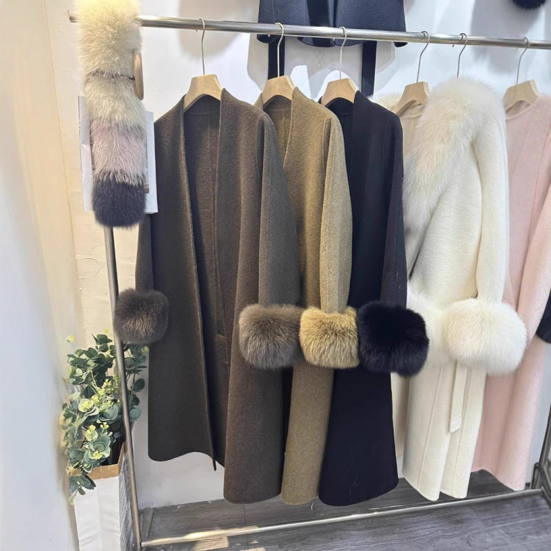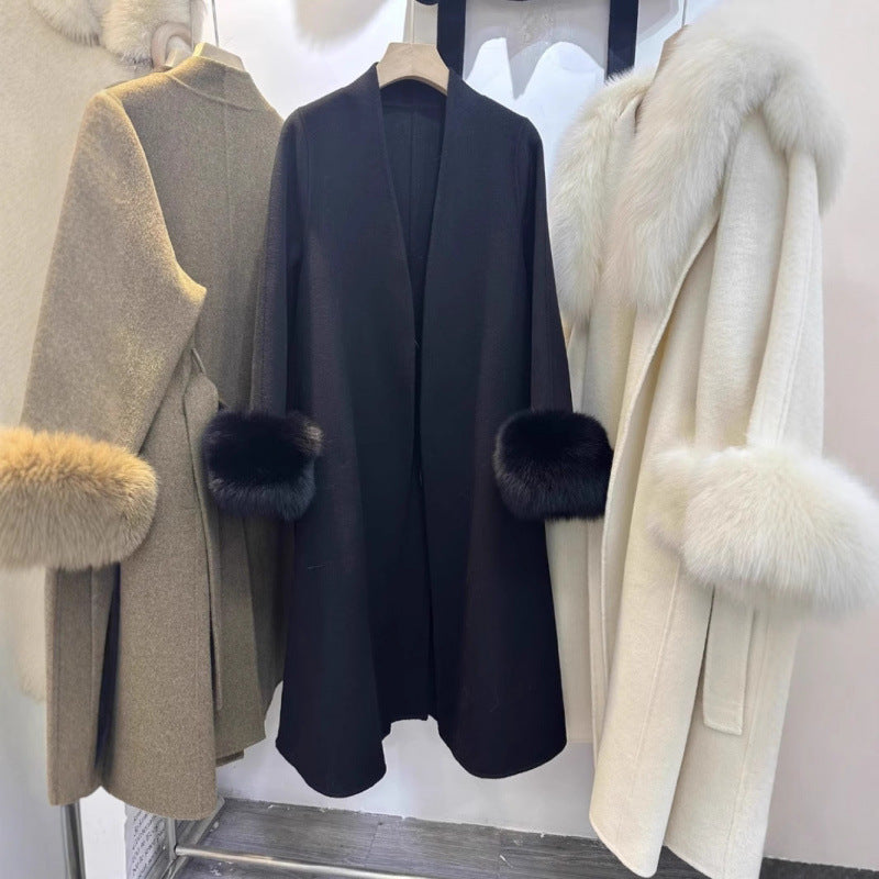 Ullkappa höst och vinter ny temperamentkrage rävpälsmuddar dubbelsidig ullkappa kvinnor