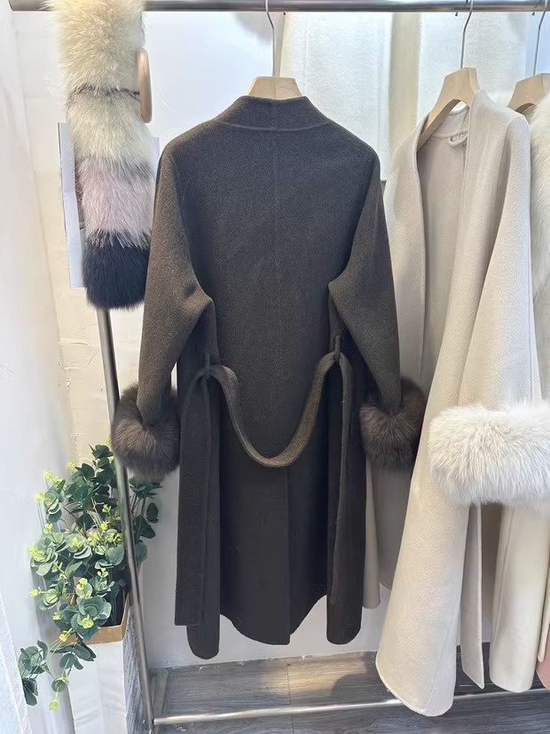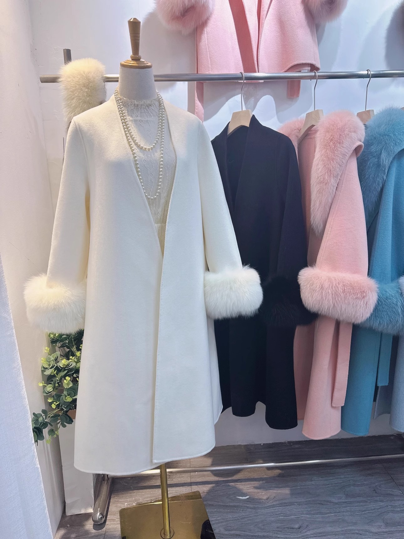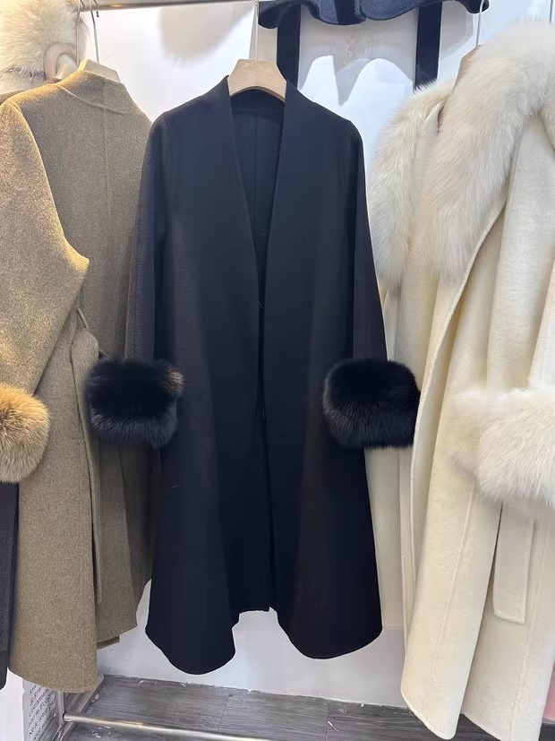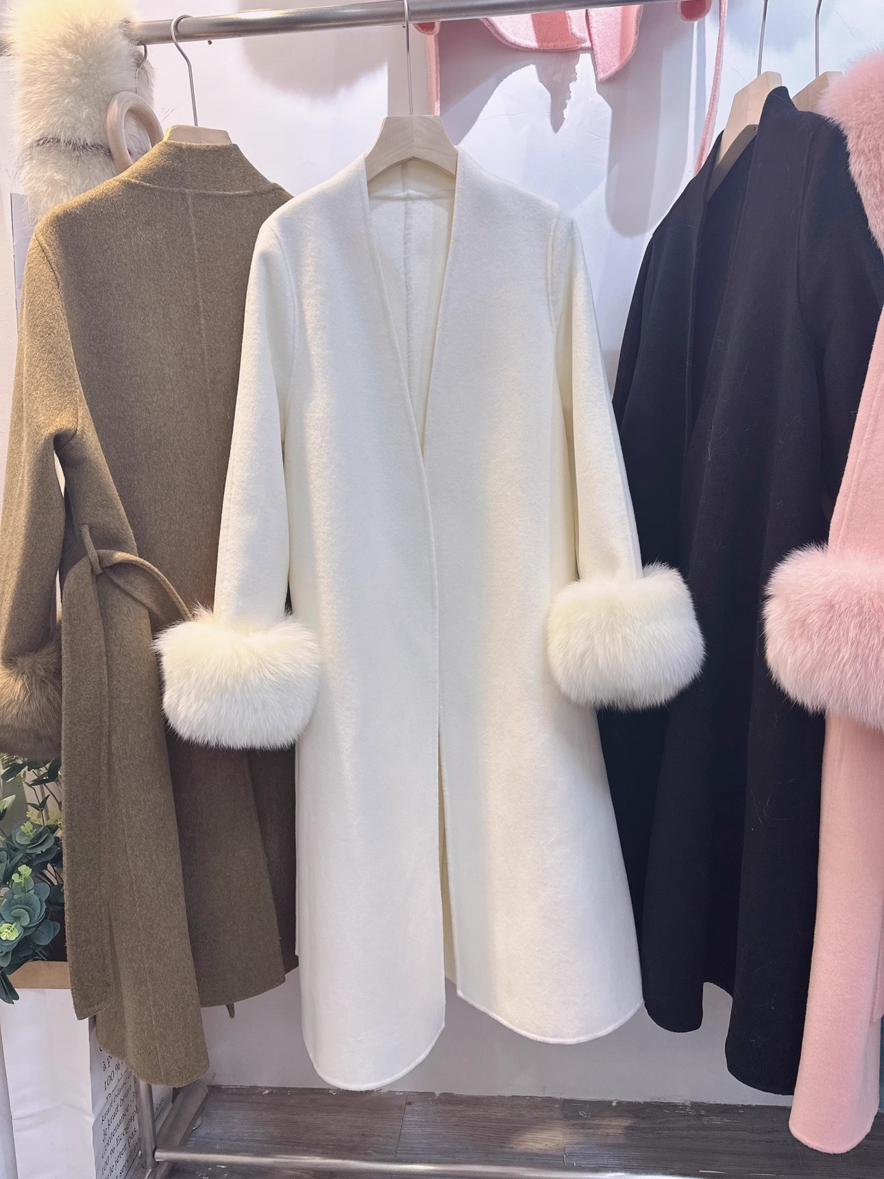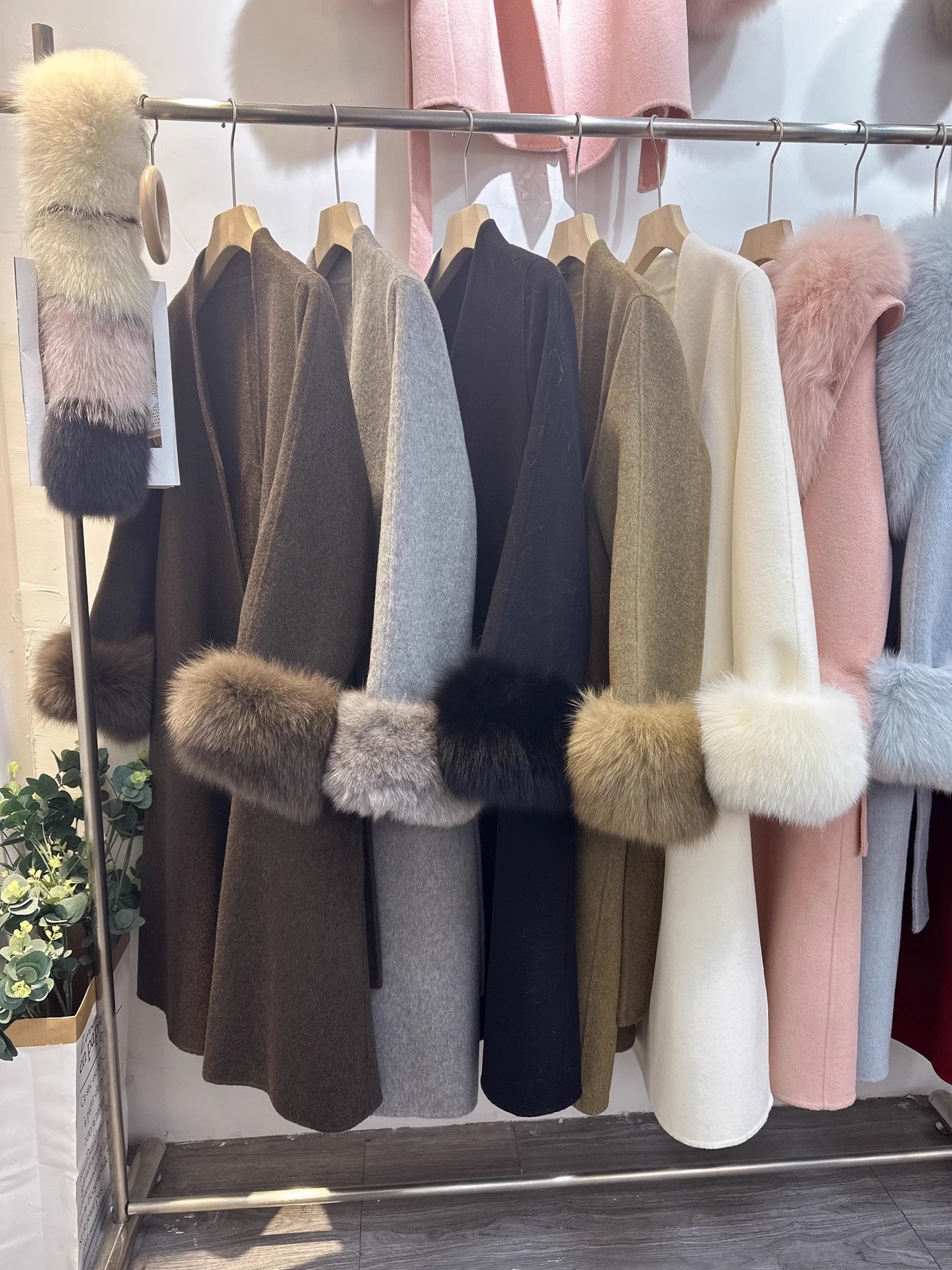 Ullkappa höst och vinter ny temperamentkrage rävpälsmuddar dubbelsidig ullkappa kvinnor